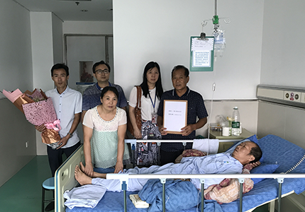 6月13日上午,棟方股份人事行政中心副總監(jiān)周金桃、工會委員會主席李亨波及生產運營中心龔冠男一行前往嚴安喜治療所在醫(yī)院進行慰問。當我們將募捐款項送到嚴安喜家人手中時,他們激動不已,再三致謝,感恩企業(yè)對嚴安喜的關心與幫助。工會主席李亨波鼓勵嚴安喜要堅強、積極、勇敢地面對疾病,樹立起戰(zhàn)勝疾病的信心,爭取早日擺脫病痛、恢復健康,并轉達了棟方股份全體員工對嚴安喜及其家屬的鼓勵。