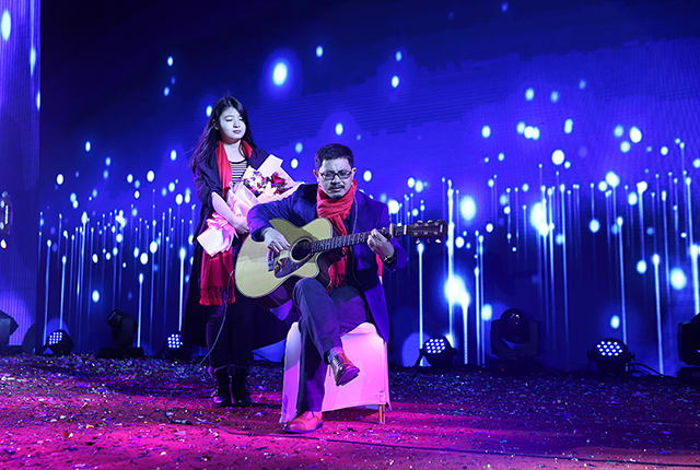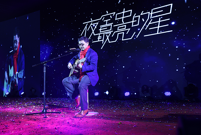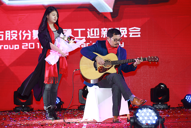 受現(xiàn)場氣氛感染,唐董也攜吉他登臺,即興彈唱了《夜空中最亮的星》、《當你老了》,鼓舞棟方股份集團的奮斗者們,在新的一年勇敢前行。