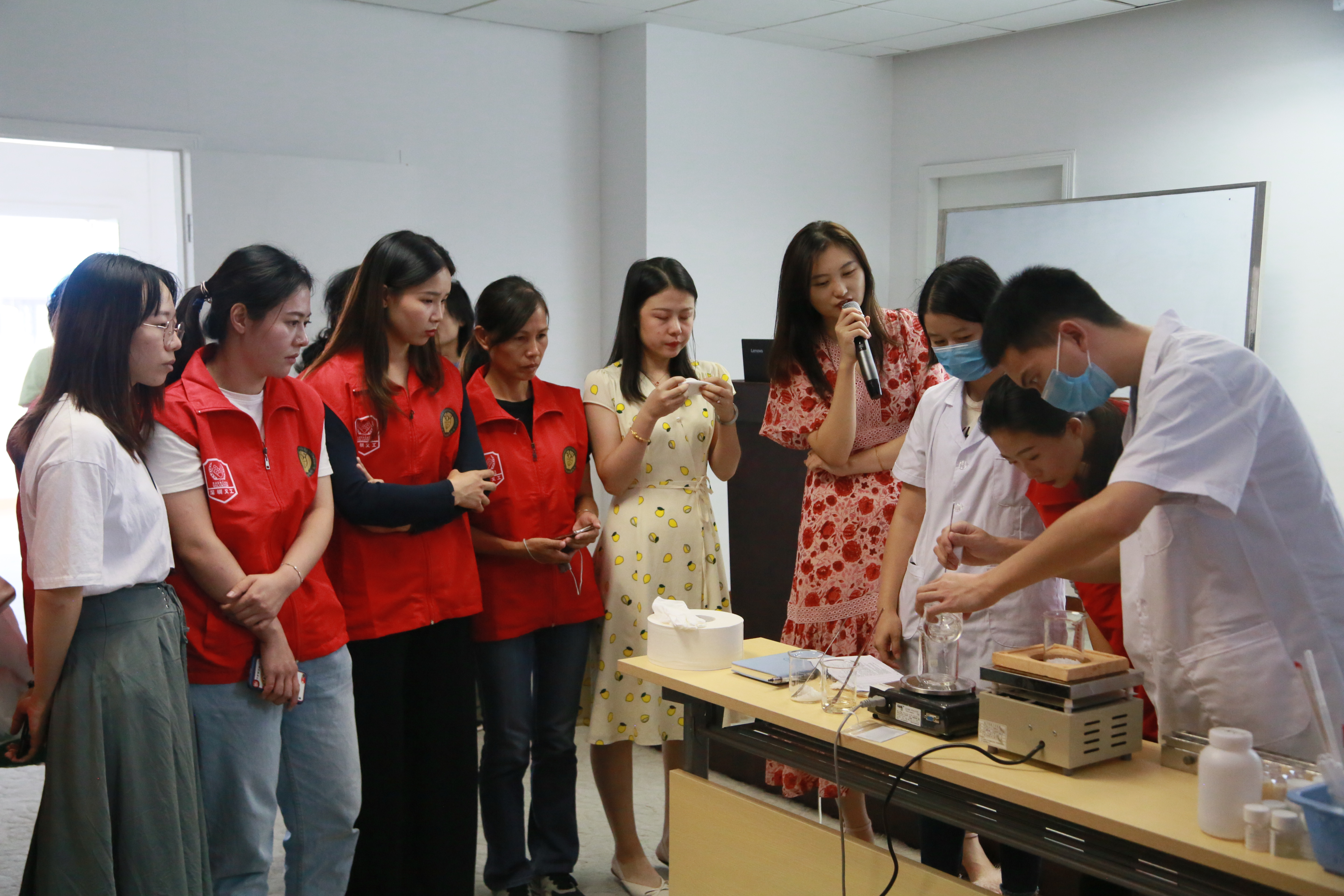 參觀(guān)完生產(chǎn)車(chē)間后,在棟方股份技術(shù)研究中心工程師的帶領(lǐng)下,體察團(tuán)來(lái)到了開(kāi)放實(shí)驗(yàn)室,和工程師一起體驗(yàn)口紅的制作過(guò)程,并在工程師的科普下了解口紅生產(chǎn)制作的時(shí)間,知道一款口紅從立項(xiàng)研發(fā)到正式生產(chǎn)大約需要6~12個(gè)月時(shí)間,其中需要?dú)v經(jīng)大概80多項(xiàng)測(cè)試環(huán)節(jié),通過(guò)人群體驗(yàn)測(cè)試產(chǎn)品使用感和功效性,通過(guò)耐寒、耐熱、折斷、涂抹等測(cè)試來(lái)把控產(chǎn)品穩(wěn)定性,通過(guò)毒理等測(cè)試以確保產(chǎn)品安全性,從而確保產(chǎn)品品質(zhì)最佳、效果最優(yōu)。
