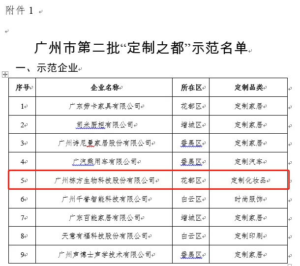 2021年10月20日,廣州市工業(yè)和信息化局官網(wǎng)公布了2021年廣州第二批“定制之都”示范單位入選名單,廣州棟方生物科技股份有限公司(簡稱:棟方股份)入選為9家“示范企業(yè)”之一,同時棟方股份成為唯一一家化妝品定制入選的企業(yè),這是對棟方股份深耕化妝品研發(fā)、樹立化妝品行業(yè)標桿的認可。