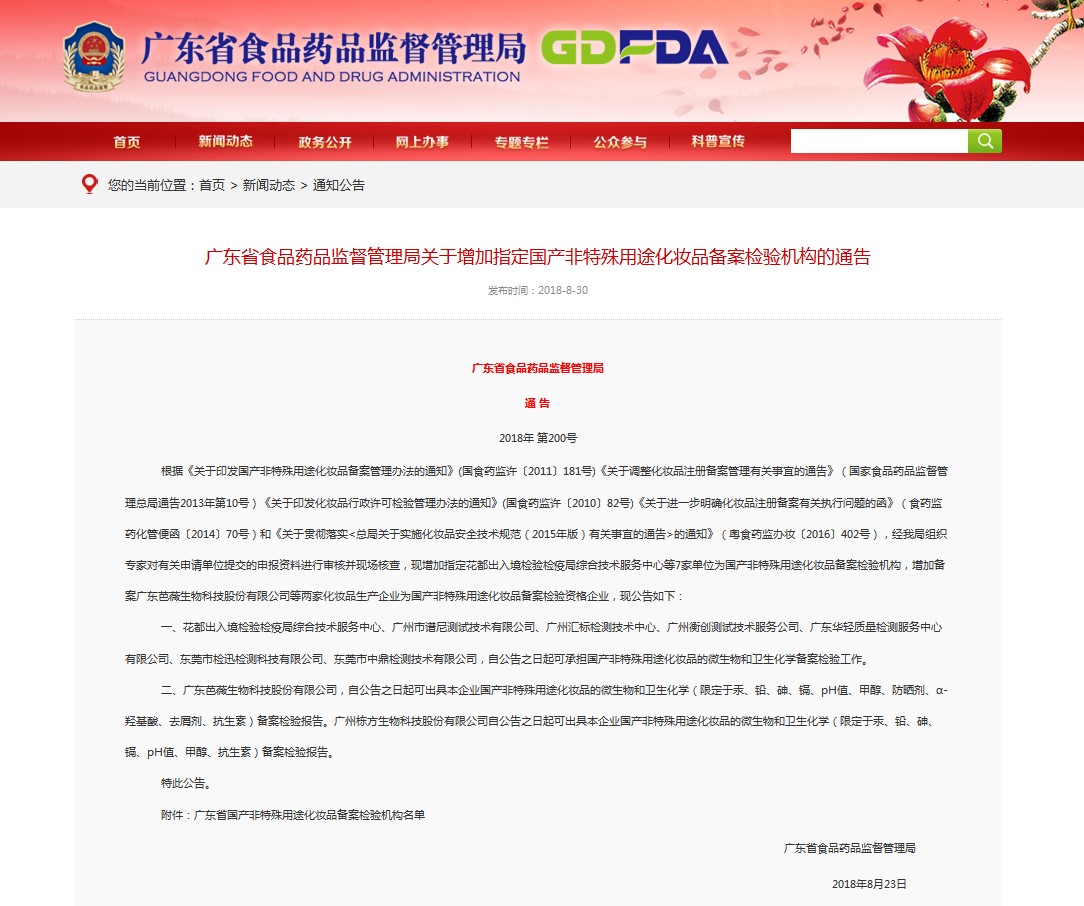 8月23日,廣東省食品藥品監(jiān)督管理局組織專家對有關(guān)申請單位提交的申報資料進行審核并現(xiàn)場核查,增加備案廣州棟方生物科技股份有限公司為國產(chǎn)非特殊用途化妝品備案檢驗資格企業(yè),廣州棟方生物科技股份有限公司自公告之日起可出具本企業(yè)國產(chǎn)非特殊用途化妝品的微生物和衛(wèi)生化學(xué)(限定于汞、鉛、砷、鎘、pH值、甲醇、抗生素)備案檢驗報告。詳細(xì)內(nèi)容請見《廣東省食品藥品監(jiān)督管理局通告》(2018年第200號)